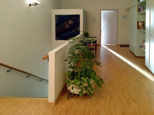Um unsere Praxis zu erreichen, müssen Sie zuerst die Treppe mit beidseitigem Geländer in den ersten Stock meistern. Für viele ist dies eine gute Aufwärmübung, für